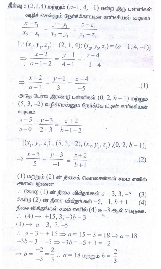 7. (2,1,4) மற்றும் (a−1,4,−1) என்ற புள்ளிகளை இணைக்கும் நேர்க்கோடு (0,2,b−1) மற்றும் (5,3,−2) என்ற புள்ளிகளை இணைக்கும் நேர்க்கோட்டுக்கு இணை எனில், a மற்றும் b –ன் மதிப்புகளைக் காண்க.