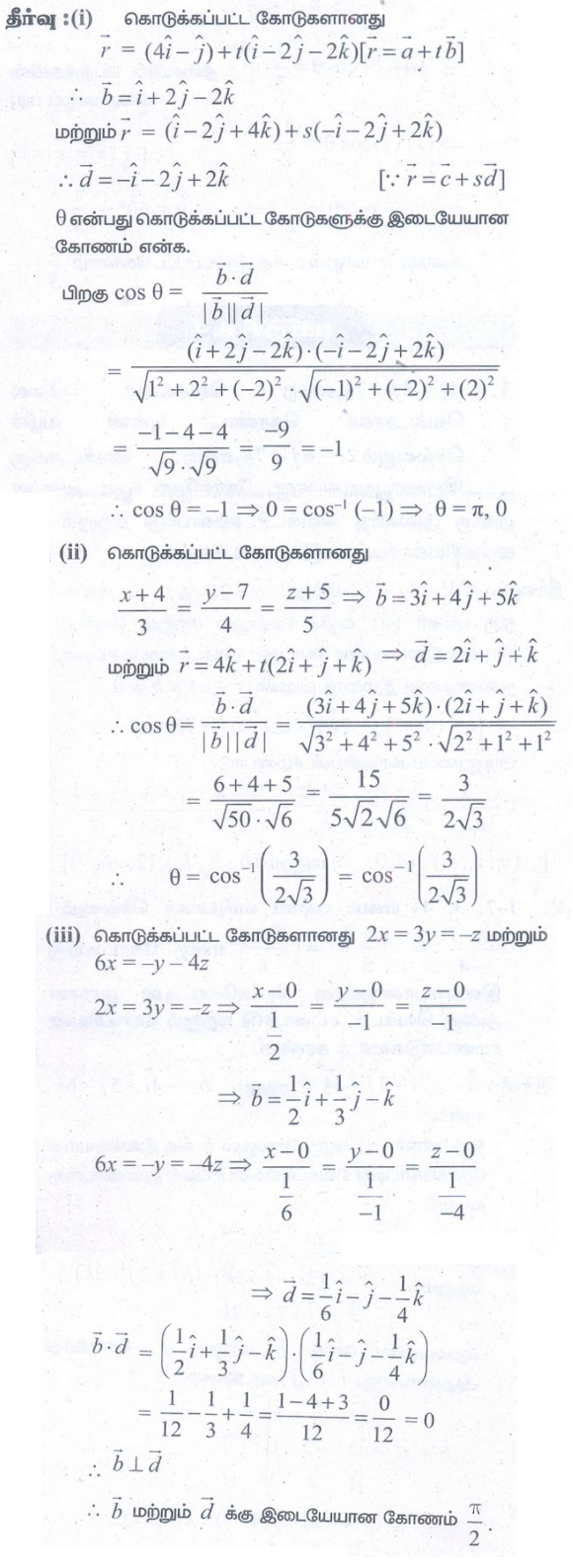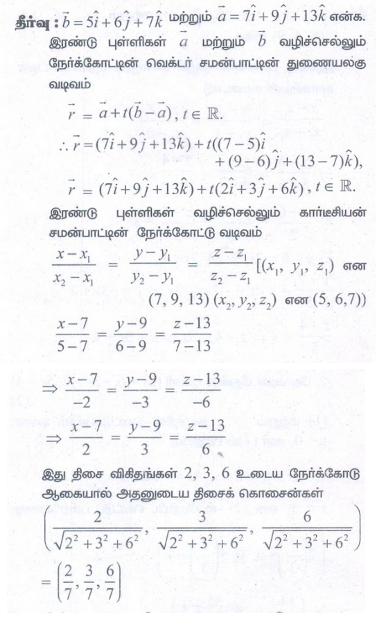 4. (5,6,7) மற்றும் (7,9,13) என்ற புள்ளிகள் வழியாகச் செல்லும் நேர்க்கோட்டின் திசைக் கொசைன்களைக் காண்க. மேலும், கொடுக்கப்பட்ட இவ்விரு புள்ளிகள் வழியாகச் செல்லும் நேர்க்கோட்டின் துணை அலகுவெக்டர் சமன்பாடு, மற்றும் கார்டீசியன் சமன்பாடுகளைக் காண்க.