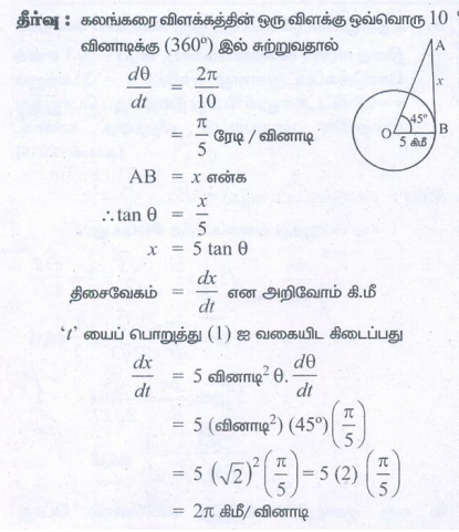 7. கப்பலின் மீதுள்ள சுழலொளி விளக்கு ஒவ்வொரு 10 வினாடிகளுக்கு ஒரு முறை சுற்றுகிறது. கடற்கரையிலிருந்து 5 கி.மீ தூரத்தில் கப்பல் நங்கூரமிடப்பட்டுள்ளது. அவ்விளக்கின் ஒளிக்கற்றை கடற்கரையுடன் 45° கோணத்தை ஏற்படுத்தும் போது கடற்கரையில் ஒளிக்கற்றை வேகமாக நகரும்?