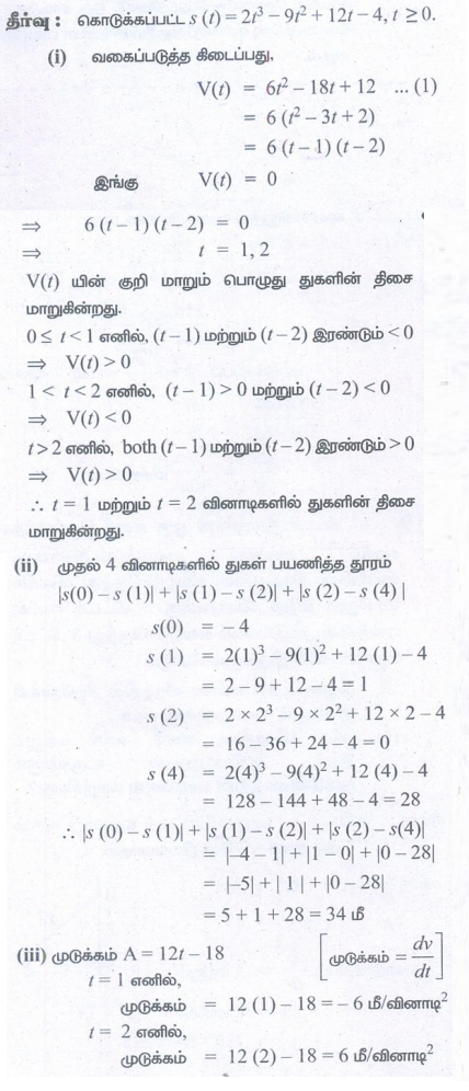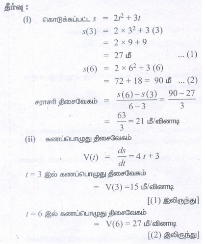 1. ஆதிப்புள்ளியிலிருந்து t வினாடிகளுக்குப் பிறகு ஒரு துகள் உள்ள தூரத்தின் அளவு s = 2t2 + 3t மீட்டர் எனும்படி நேர்க்கோட்டில் ஒரு துகள் நகர்கிறது.