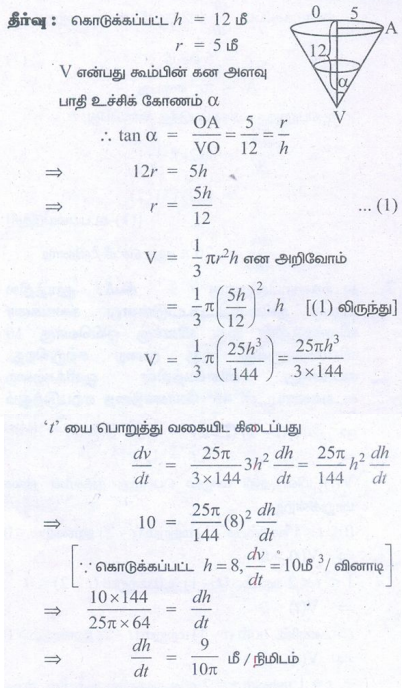 8. தலைகீழாக வைக்கப்பட்ட ஒரு நேர்வட்ட கூம்பின் வடிவில் உள்ள ஒரு நீர்நிலைத் தொட்டியின் ஆழம் 12 மீட்டர் மற்றும் மேலுள்ள வட்டத்தின் ஆரம் 5 மீட்டர் என்க. நிமிடத்திற்கு 10 கன மீட்டர் வேகத்தில் நீர் பாய்ச்சப்படுகிறது எனில், 8 மீட்டர் ஆழத்தில் நீர் இருக்கும்போது நீரின் ஆழம் அதிகரிக்கும் வேகம் என்ன?