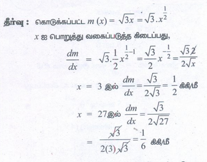 5. x நீளமுள்ள (மீட்டரில்) ஒரு மெல்லிய கோலின் நிறை m(x) (கிலோகிராமில்), m(x) = √3x எனக் கொடுக்கப்பட்டுள்ளது எனில், x = 3 மற்றும் x = 27 மீட்டர் எனும்போது நீளத்தைப் பொறுத்து நிறையின் மாறுபாட்டு வீதத்தை காண்க.
