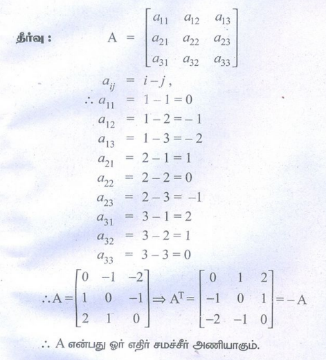 (21) aij = i − j எனில், A = [aij]3×3 என்ற அணியை உருவாக்குக. மேலும், A என்பது சமச்சீர் அணியா அல்லது எதிர் சமச்சீர் அணியா எனக் கூறுக.