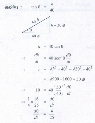 2. ஒரு பலூனானது செங்குத்தாக மேல்நோக்கி 10 மீ/வி வீதத்தில் செல்கிறது.பலூன் செலுத்தப்பட்ட இடத்திலிருந்து 40 மீ தொலைவில் இடருந்து ஒருவர் இதனைப் பார்க்கிறார். பலூனின் ஏற்றக் கோணத்தில் ஏற்படும் மாறுபாட்டு வீதத்தை பலூன் தரையிலிருந்து 30 மீட்டர் உயரத்தில் இருக்கும்போது காண்க.