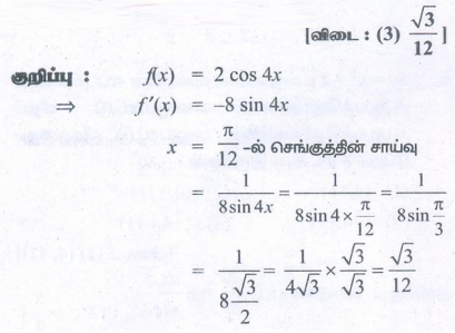 7. f (x) = 2cos 4x என்ற வளைவரைக்கு x = π/12 -ல் செங்கோட்டின் சாய்வு