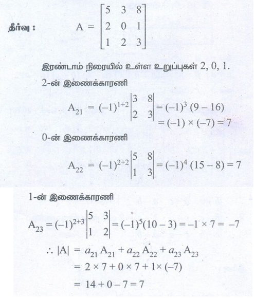 என்ற அணியின் இரண்டாம் நிரையில் உள்ள உறுப்புகளின் இணைக்காரணிகளைப் பயன்படுத்தி, | A |−ன் மதிப்பைக் காண்க.