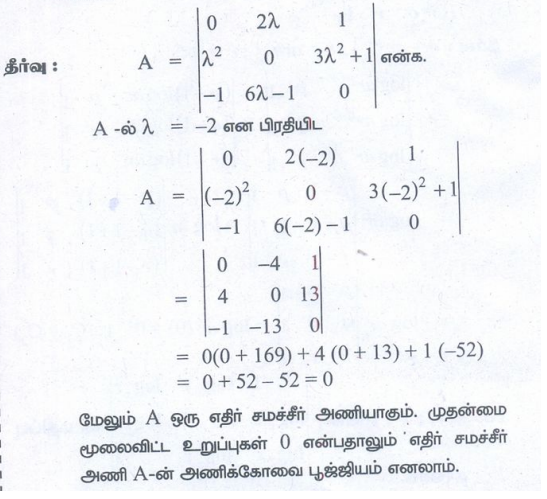 (7) 3 × 3 வரிசை உடைய எதிர் சமச்சீர் அணியின் பொது வடிவத்தை எழுதுக. அதன் அணிக்கோவையின் மதிப்பு 0 எனக் காட்டுக.