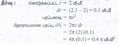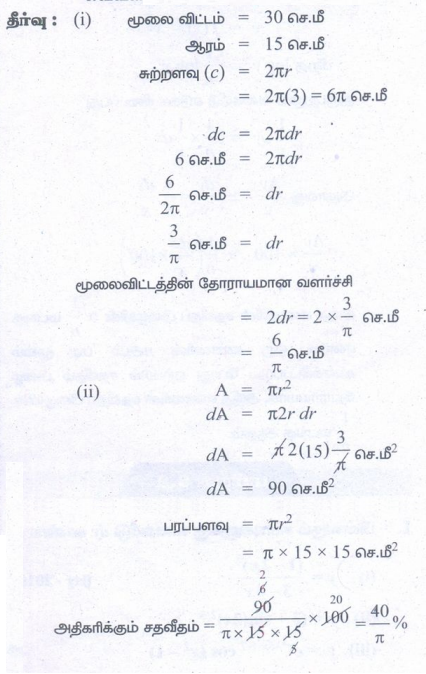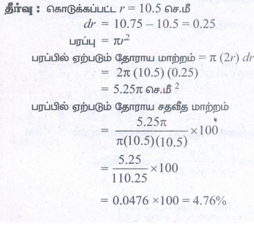 10. ஒரு வட்ட வடிவத் தகடு வெப்பத்தினால் சீராக விரிவடைகின்றது என்க. அதன் ஆரம் 10.5 செமீ-இலிருந்து 10.75 செ.மீ-ஆக அதிகரிக்கும்போது அதன் பரப்பில் ஏற்படும் தோராய அதிகரிப்பு மற்றும் தோராய சதவீத அதிகரிப்பு ஆகியவற்றைக் காண்க