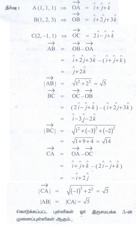 (17) A (1, 1, 1), B(1, 2, 3) மற்றும் C(2, −1, 1) ஆகிய புள்ளிகள் ஓர் இரு சமபக்க முக்கோணத்தின் முனைப்புள்ளிகள் என நிறுவுக.