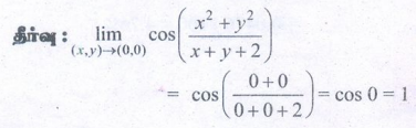 2.எல்லை மதிப்பு இருக்குமானால், lim(x,y)→(0,0) cos ( x3 + y2 / x + y +2 ) -ஐ மதிப்பிடுக.