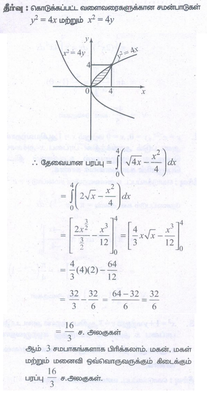 8. ஒரு குடும்பத் தலைவர், x = 0 , x = 4, y = 4 மற்றும் y = 0 ஆகியவற்றால் அடைபடும் சதுரநிலத்தின் பரப்பை y2 = 4x மற்றும் x2 = 4y என்ற வளைவரைகளின் வாயிலாக தன்னுடைய மனைவி, மகள் மற்றும் மகன் ஆகியோர்களுக்கு மூன்று சம்பாகங்களாகப் பிரிக்க விரும்புகிறார். அவ்வாறு பிரிக்க இயலுமா? பிரிக்க இயலும் எனில் ஒவ்வொருவருக்கும் கிடைக்கும் பரப்பைக் காண்க.