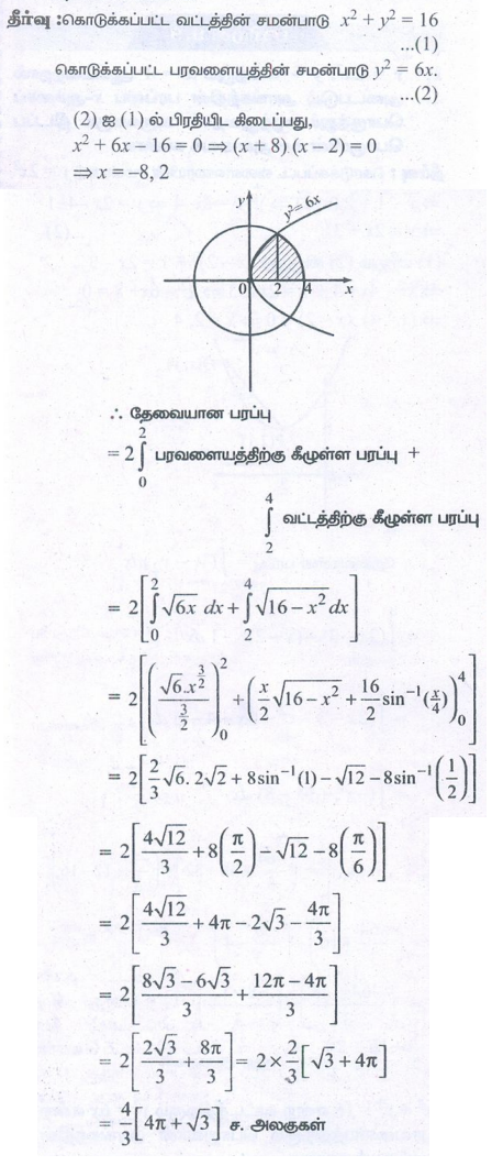 10. x2 + y2 =16 என்ற வட்டத்திற்கும் y2 = 6x என்ற பரவளையத்திற்கும் பொதுவானஅரங்கத்தின் பரப்பைக் காண்க.