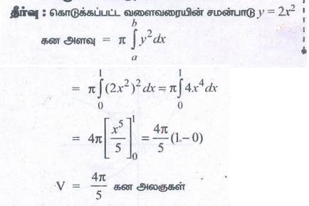 4. y = x மற்றும் y = x2 என்ற வளைவரைகளுக்குள் அடைபடும் அரங்கத்தின் பரப்பு R எனில் பரப்பு R-ஐ, x-அச்சைப் பொருத்து 360° சுழற்றும்போது உருவாகும் திடப்பொருளின் கன அளவைக் காண்க.