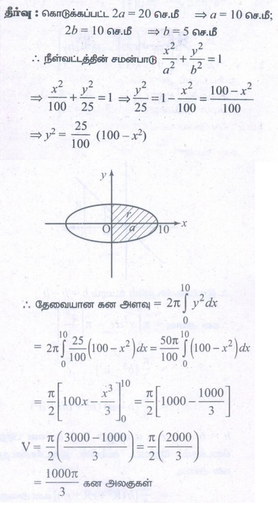 6. ஒரு தர்பூசணியானது நீள்வட்ட திண்ம வடிவில் (ellipsoid shape) உள்ளது. இந்த நீள்வட்ட தின்மத்தை பெற நெட்டச்சின் நீளம் 20 செ.மீ. குற்றச்சின் நீளம் 10 செ.மீ கொண்ட நீள்வட்டத்தை நெட்டச்சைப் பொருத்து சுழற்ற வேண்டும் எனில் தர்பூசணியின் கன அளவை தொகுதியிடலைப் பயன்படுத்தி காண்க.