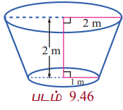 5. ஒரு கொள்கலன் (container) ஆனது நேர்வட்டக் கூம்பின் இடைக்கண்டம் (frustum ofa cone) வடிவில் படம் 9.46-ல் உள்ளவாறு அமைந்துள்ளது எனில் அதன் கனஅளவைத் தொகுதியிடலைப் பயன்படுத்தி காண்க.