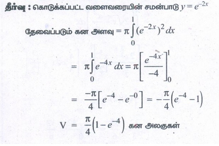 2. y = e-2x y = 0, x = 0 மற்றும் x = 1 ஆகியவற்றால் அடைபடும் அரங்கத்தின் பரப்பை x-அச்சைப் பொருத்து சுழற்றுவதால் உருவாகும் திடப்பொருளின் கனஅளவைக் காண்க.