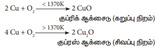 வினைபுரிந்து இருவேறு ஆக்சைடுகளை உருவாக்கும். CuO, Cu2O.