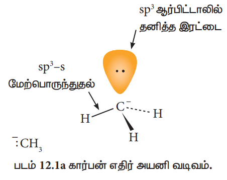 பொதுவாக, கார்பன் எதிர் அயனியானது பிரமிடு வடிவத்தினைப் பெற்றிருக்கும் மேலும் தனித்த இரட்டை எலக்ட்ரானானது கார்பனின் ஒரு sp3 இனக்கலப்பு ஆர்பிட்டாலில் இடம் பெற்றிருக்கும்.