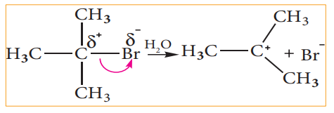 எடுத்துக்காட்டாக, மூவிணைய பியூட்டைல் புரோமைடில் உள்ள புரோமின் அதிக எலக்ட்ரான் கவர் தன்மை பெற்றிருப்பதால் C-Br பிணைப்பானது ஒரு முனைவுள்ள பிணைப்பாகும். C-Br பிணைப்பில் உள்ள பிணைப்பு எலக்ட்ரான்கள் கார்பனைக் காட்டிலும் புரோமினால் அதிக அளவு கவரப்படுகின்றன. எனவே, நீராற்பகுத்தலில், C-Br பிணைப்பானது சீரற்ற பிளப்பிற்கு உட்பட்டு மூவிணைய பியூட்டைல் நேர் அயனியினைத் தருகிறது.