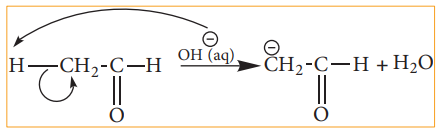 ஆல்டிஹைடு அல்லது கீட்டோன்களில் காணப்படும் C-H பிணைப்பு பிளவுபடுதலை நாம் கருதுவோம். ஹைட்ரஜனைக் காட்டிலும் கார்பன் அதிக எலக்ட்ரான் கவர்தன்மை உடையது என நாம் அறிவோம் எனவே C-H பிணைப்பின் சீரற்ற பிளவால் கார்பன் எதிர் அயனி உருவாகிறது. எடுத்துக்காட்டாக ஆல்டால் குறுக்க வினையில் OH- அயனியானது ஆல்டிஹைடின் α-ஹைட்ரஜனைக் கவர்வதால் பின்வரும் எதிர் அயனி உருவாகிறது.