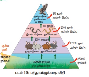 உணவுச்சங்கிலியில் ஆற்றல் ஓட்டம் மற்றும் 10 விழுக்காடு ஆற்றல் மட்டுமே ஒவ்வொரு ஊட்ட மட்டத்திற்கும் கடத்தப்படுவதோடு மீதமுள்ள 90 விழுக்காடு ஆற்றல் இழக்கப்படுகிறது என்பதை மாணவர்கள் அறிவர்.