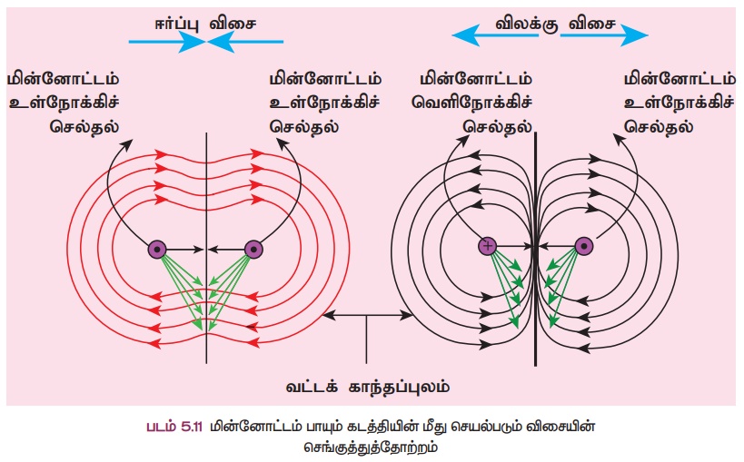 இரண்டு கடத்திகளிலும் எதிரெதிர் திசையில் மின்னோட்டம் பாயுமானால் இரண்டு கடத்திகளின் மீது செயல்படும் விசையும் ஒன்றையொன்று விலக்குமாறு அமையும். இவை படம் 5.10 இல் காட்டப்பட்டுள்ளன.
