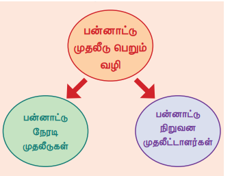 * வெளிநாட்டு நேரடி மூலதனம் : ஒரு நாட்டில் வேறுநாட்டு நிறுவனம் உற்பத்தி துறையில் முதலீடு செய்வதையே வெளிநாட்டு நேரடி மூலதனம் என்கிறோம்.