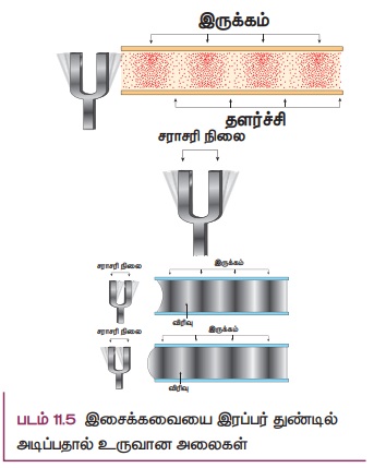 ஒரு இரப்பர் துண்டில் ஒரு இசைக்கவையை அடித்தால் இசைக்கவையின் புயங்கள் அதன் மையப்புள்ளியைப் பொருத்து அதிர்வுறும். புயம் ஒரு மையப்புள்ளியைப் பொருத்து அதிர்வுறும் என்பதன் அர்த்தம் (படம் 11.5 இல் குறிப்பிட்டுள்ளவாறு) வெளிப்புறம் மற்றும் உட்புறம் செல்லுதல் ஆகும். புயமானது வெளிப்புறமாக நகரும்போது அதன் அருகில் உள்ள காற்று அடுக்கை அது தள்ளுகிறது, அதாவது இப்பகுதியில் அதிகமான காற்று மூலக்கூறுகளின் தேக்கம் உள்ளது. எனவே அடர்த்தி மற்றும் அழுத்தமும் கூட மிக அதிகமாகும் இப்பகுதிகள் இறுக்கப்பட்ட பகுதிகள் அல்லது இறுக்கங்கள் எனப்படும். இறுக்கப்பட்ட காற்று அடுக்கு முன்னோக்கி நகர்ந்து அருகில் உள்ள அடுத்த காற்று அடுக்கை இறுக்கும். இதே முறையில் ஒரு இறுக்கத்தின் அலை காற்றின் வழியே முன்னேறிச் செல்லுகிறது. புயமானது உட்புறமாக நகரும்போது வலப்புறமாக நகர்த்த ஊடகத்தின் துகள்கள் தற்போது பின்புறமாக காற்றின் மீட்சிப்பண்பு காரணமாக இடது புறமாக நகருகிறது. இந்தப் பகுதியில் அடர்த்தி மற்றும் அழுத்தம் இரண்டும் குறைவாக உள்ளது. இது தளர்ச்சி அல்லது நீட்சி எனப்படும்.