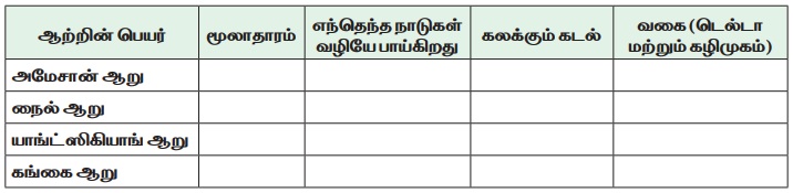 கொடுக்கப்பட்டுள்ள நிலவரைபடத்திலுள்ள பெரிய ஆறுகளின் மூலாதாரம் மற்றும் முடிவுறும் இடம் ஆகியவற்றை அட்டவணைப்படுத்துக.