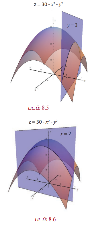 g(x,3) = 21 - x2 என்பது ஒரு பரவளையம், இது z = 30 - x2 - y2 என்ற வளைபரப்பும் y =3 என்ற தளமும் வெட்டும்போது கிடைப்பது ஆகும். (படம் 8.5-ஐக் காண்க). இதுபோல் g(2,y) = 26 - y2 என்பது ஒரு பரவளையம் ; இது z = 30 - x2 - y2 என்ற வளைபரப்பும் x = 2 என்ற தளமும் வெட்டும்போது கிடைக்கின்றது. (படம் 8.6-ஐக் காண்க). பின்வரும் வரைபடங்கள் மேற்கண்ட விவாதங்களை விவரிக்கின்றன.