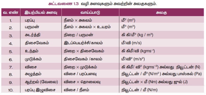 அட்டவணை 1.3 வழி அளவுகளும் அவற்றின் அலகுகளும்.