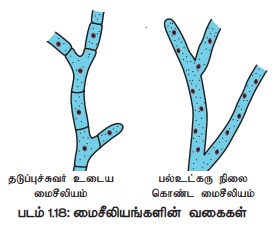 தடுப்புச்சுவர் காணப்படுவதன் அடிப்படையில் மைசீலியங்கள் இரண்டு வகையாகப் பிரிக்கப்பட்டுள்ளன (படம் 1.18). கீழ்நிலை பூஞ்சைகளில் ஹைஃபாக்கள் தடுப்புச்சுவரற்றும், எண்ணற்ற உட்கருக்களைக் கொண்டும் காணப்படுவது பல் உட்கரு மைசீலியம் என்று அறியப்படுகிறது. எடுத்துக்காட்டு: அல்புகோ. மேம்பாடடைந்த வகுப்புப் பூஞ்சைகளில் ஹைஃபாக்களின் செல்களுக்கிடையே தடுப்புச்சுவர் காணப்படுகிறது. எடுத்துக்காட்டு: ஃபியுசேரியம்.