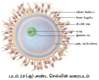 மனித அண்ட செல்லானது நுண்ணிய , ஓடற்ற, கரு உணவு அற்ற தன்மையுடைய செல் ஆகும். (படம் 2.8(ஆ)) இதன் சைட்டோபிளாசம் ‘ஊபிளாசம்’ (Ooplasm) என்று அழைக்கப்படும். இதனுள் காணப்படும் பெரிய உட்கருவிற்கு ‘வளர்ச்சிப்பை’ (Germinal Vesicle) என்று பெயர். அண்ட செல் மூன்று உறைகளைக் கொண்டது. மெல்லிய ஒளி ஊடுருவும் 'விட்டலின் சவ்வு' (Vitelline membrance) உட்புறத்திலும் தடித்த ‘சோனா பெலூசிடா’ (Zona pellucida) அடுக்கு நடுப்பதியிலும் மற்றும் நுண்பை செல்களால் சூழப்பட்ட தடித்த ‘கரோனா ரேடியேட்டா’ (Corona radiata) உறை வெளிப்புறத்திலும் அமைந்துள்ளன. விட்டலின் சவ்வுக்கும் சோனா பெலூசிடாவுக்கும் இடையில் ஒரு குறுகிய ‘விட்டலின் புற இடைவெளி’ (Perivitelline space) காணப்படுகிறது.