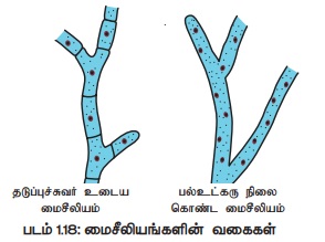 இரண்டு வகையாகப் பிரிக்கப்பட்டுள்ளன (படம் 1.18). கீழ்நிலை பூஞ்சைகளில் ஹைஃபாக்கள்