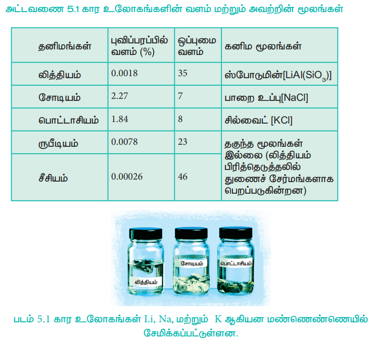 அட்டவணை 5.1 கார உலோகங்களின் வளம் மற்றும் அவற்றின் மூலங்கள்