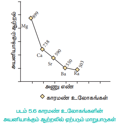 படம் 5.6 காரமண் உலோகங்களின் அயனியாக்கும் ஆற்றலில் ஏற்படும் மாறுபாடுகள்