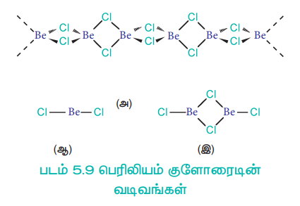 Be2+ அயனியானது சிறிய உருவளவைப் பெற்றிருப்பதால் பெரிலியம் ஹேலைடு சகப்பிணைப்புத் தன்மையினைப் பெற்றுள்ளது. பெரிலியம் ஹேலைடுகள் நீர் உறிஞ்சும் தன்மையுடையவை, ஈரக்காற்றில் புகையும் மற்றும் கரிமக்கரைப்பானில் கரையும். படம் 5.9 [வடிவம் (அ)] ல் கண்டுள்ளவாறு பெரிலியம் குளோரைடு திட நிலையில் சங்கிலி வடிவத்தினைப் பெற்றுள்ளது. ஆவி நிலைமையில் BeCl2, குளோரினை இணைப்பு பாலமாக கொண்டுள்ள இருபடி வடிவமைப்பினை (வடிவம் - இ) பெற்றுள்ளது. இது 1200K அளவிலான அதிக வெப்பநிலையில் நேர்கோட்டு ஒருபடியாக சிதைவுறுகிறது (வடிவம் - ஆ).