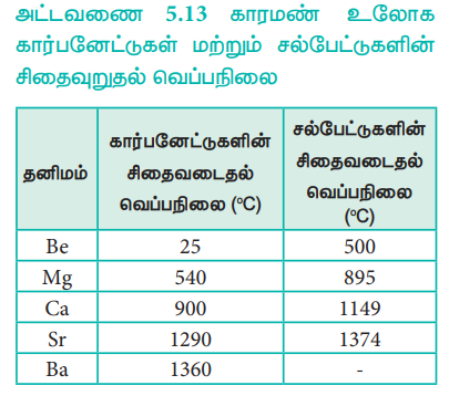 அட்டவணை 5.13 காரமண் உலோக கார்பனேட்டுகள் மற்றும் சல்பேட்டுகளின் சிதைவுறுதல் வெப்பநிலை