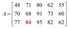 மேற்கண்ட அணியில் மூன்றாவது நிரை மற்றும் இரண்டாவது நிரலில் அமைந்துள்ள 84 என்ற உறுப்பு, ஆங்கிலப் பாடப்பிரிவில் தேர்வு 3−ல் அம்மாணவர் பெற்ற மதிப்பெண்ணைக் குறிப்பிடுகிறது.