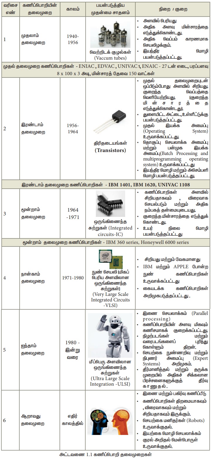 தொழில்நுட்பத்தின் வளர்ச்சி, கணிப்பொறித் துறையின் வளர்ச்சியைத் தீர்மானிக்கின்றது. பல்வேறு வடிவமைப்பு கட்டங்களின் அடிப்படையில் கணிப்பொறிகளைப் பல தலைமுறைகளாக வகைப்படுத்தலாம்.
