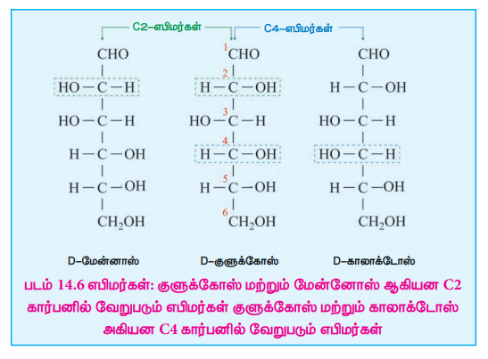 படம் 14.6 எபிமர்கள்: குளுக்கோஸ் மற்றும் மேன்னோஸ் ஆகியன C2 கார்பனில் வேறுபடும் எபிமர்கள் குளுக்கோஸ் மற்றும் காலாக்டோஸ் - அகியன C4 கார்பனில் வேறுபடும் எபிமர்கள்