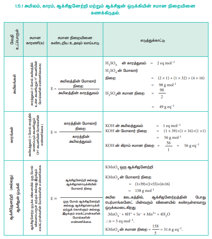 மேற்கண்டுள்ள கூற்றினைப் பயன்படுத்தி, வேதி உட்பொருட்களை நாம் வகைப்படுத்துவதுடன், பின்வரும் அட்டவணையில் அவற்றின் சமான நிறையினைக் கண்டறிய உதவும் வாய்ப்பாட்டினைக் கண்டறிவோம்.