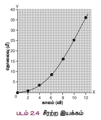 கடந்த தொலைவு மற்றும் எடுத்துக் கொண்ட நேரம் ஆகியவற்றிற்கான ஒரு வரைபடத்தை நாம் வரைந்தால் அது படம் 2.4 ல் காட்டப்பட்டுள்ளவாறு அமையும்.
