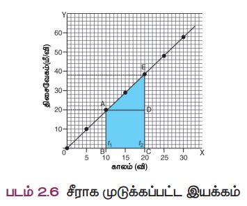 மகிழுந்தின் இயக்கத்திற்கான திசைவேகம்காலம் வரைபடம் படம் 2.6 ல் காட்டப்பட்டுள்ளது. சம கால இடைவெளியில் திசைவேகமானது சம அளவு மாறுபடுவதை வரைபடம் காட்டுகிறது. ஆகவே,