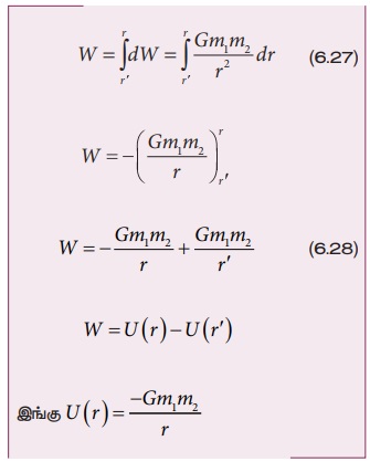 m1 மற்றும் m2 என்ற இரு நிறைகள் ஆரம்பத்தில் r' தொலைவில் உள்ளன. m1 நிறையானது நிலையாக உள்ளது என்க. நிறை m2 ஐ r' நிலையில் இருந்து r நிலைக்கு 6.12 (a) இல் காட்டியுள்ளபடி நகர்த்த வேலை செய்ய வேண்டும்.