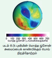 புவியின் மொத்த ஓ சோன் அமைப்பைக் காண்பிக்கும் மொத்த ஓசோன் (டாப்ஸன்அலகுகளில் பொய் ஊதா மற்றும் நீல நிறங்கள் ஓசோன் மிகக் குறைந்த பகுதியாகும். மஞ்சள் மற்றும் சிவப்பு நிறப் பகுதிகள் ஓசோன் மிகு பகுதியென அறியலாம்.