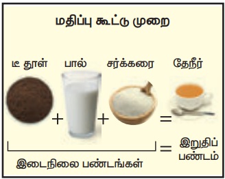 பயன்படுத்தப்படும் டீதூள், பால் மற்றும் சர்க்கரை “இடைநிலை பண்டங்கள்" ஆகும். ஒரு கோப்பை தேனீர் இறுதிப் பண்டமாக மாறுவதற்கு இவைகள் ஒரு பகுதியாக அமைகிறது.