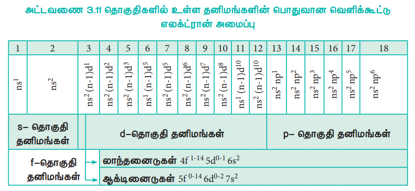 ஒரு தொகுதியில் உள்ள தனிமங்கள் அனைத்தும் அவற்றின் வெளிக்கூட்டில், ஒத்த எலக்ட்ரான் அமைப்பினைப் பெற்றுள்ளன. அட்டவணை (3.11)ல் பதினெட்டு தொகுதிகளுக்கான பொதுவான வெளிக்கூட்டு எலக்ட்ரான் அமைப்பு கொடுக்கப்பட்டுள்ளது. தனிமங்களின் கடைசி இணைதிற எலக்ட்ரான் சென்று சேரக்கூடிய ஆர்பிட்டாலின் அடிப்படையில் தனிமங்களை s, p, d மற்றும் f தொகுதி தனிமங்கள் என வகைப்படுத்தலாம்.
