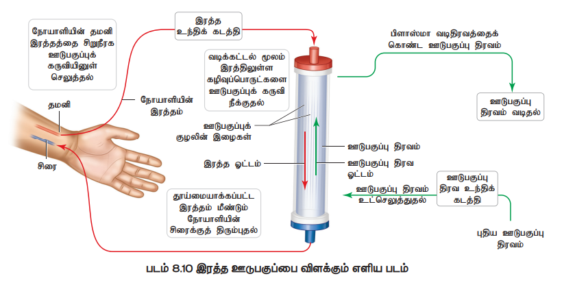 உடலுடன் இணைக்கப்படும் (படம் 8.10). அக்கருவியில் உள்ள செல்லுலோசால் ஆன நீண்ட குழல் ஊடுபகுப்பு திரவத்தால் சூழப்பட்டிருக்கும். இந்த அமைப்பு ஒரு நீர்த்தொட்டியினுள் மூழ்கி இருக்கும். நோயாளியின் கைத்தமனியிலிருந்து எடுக்கப்படும் இரத்தத்துடன் ஹிப்பாரின் போன்ற இரத்த உறைவு எதிர்பொருள் சேர்த்து ஊடுபகுப்புக் கருவியினுள் செலுத்தப்படுகிறது. செல்லுலோஸ் குழலில் உள்ள நுண்ணிய துளைகளின் வழியே சிறுமூலக்கூறுகளான குளுக்கோஸ், உப்புக்கள் மற்றும் யூரியா போன்றவை நீருக்குள் வந்துவிடும். அதேவேளையில், இரத்த செல்கள் மற்றும் புரத மூலக்கூறுகள் இத்துளையின் வழியே ஊடுருவ இயலாது. இந்நிலை ஏறத்தாழ கிளாமருலார் வடிகட்டுதலைப் போன்றதாகும். குழல் மூழ்கியுள்ள திரவத்தில் உப்பு மற்றும் சர்க்கரைக்கரைசல் சரியான விகிதத்தில் உள்ளதால், இரத்தத்திலுள்ள குளுக்கோஸ் மற்றும் அவசியமான உப்புகளின் இழப்பு தடுக்கப்படுகிறது. இவ்வாறு சுத்தப்படுத்தப்பட்ட இரத்தம் மீண்டும் நோயாளியின் உடலுக்குள் ஒரு சிரையின் வழியாக செலுத்தப்படுகிறது.