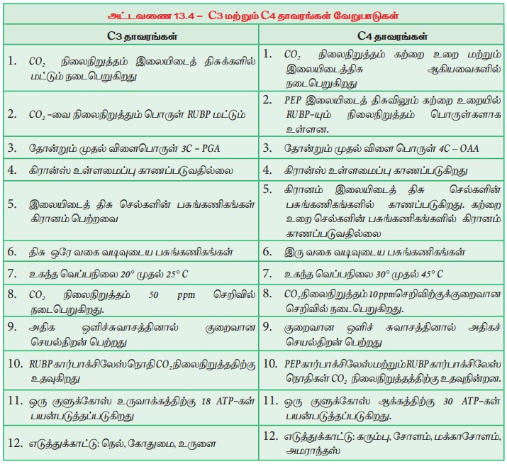 C3 தாவரங்கள் (C3 சுழற்சி) மற்றும் C4 தாவரங்கள் (C4 சுழற்சி) ஆகியவற்றிற்கிடையேயான வேறுபாடுகள் அட்டவணை 13.4 விவரிக்கப்பட்டுள்ளது.